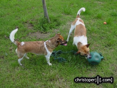 The dogs like to play tug of war with a horse leadrope and a jollyball . . .